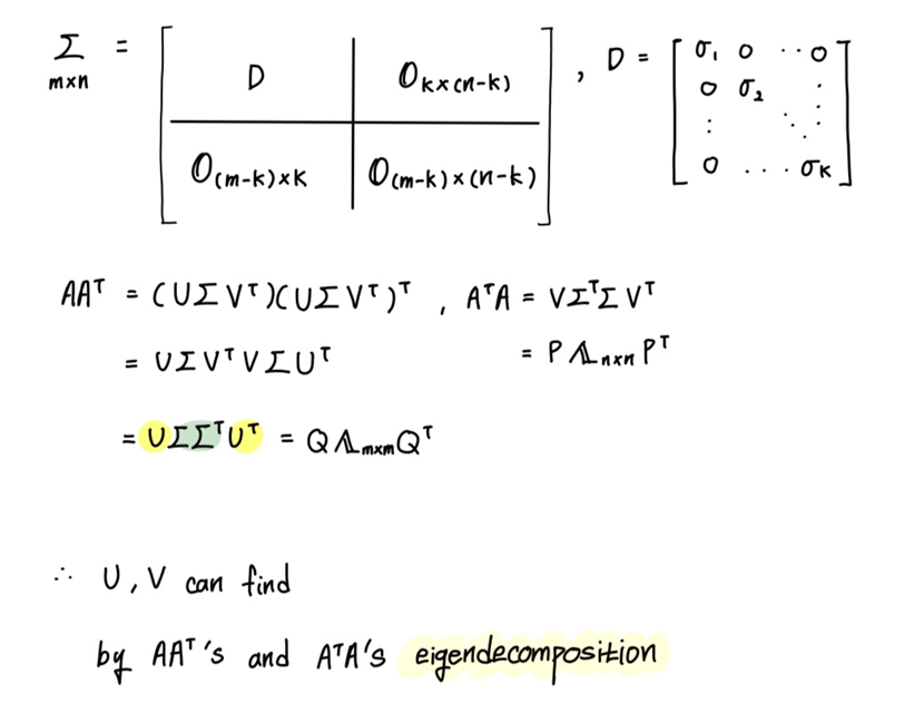 위의 식은 비로소 main diagonal(정사각행렬이 아니더라도 주대각 행렬의 형태를 갖춘 행렬) 아니더라도 다양한 상황에서 decomposition을 사용할 수 있는 것을 의미한다. 이때 ∑는 main diagonal로 아래와 같은 형태인데, 이를 이용하면 U,V는 쉽게 계산을 할 수가 있다. 우선 \(A^TA와 AA^T\)는 symmetrix 하므로 각각 eigendecomposition이 가능한다는 전제 하에 아래을 봐보자.