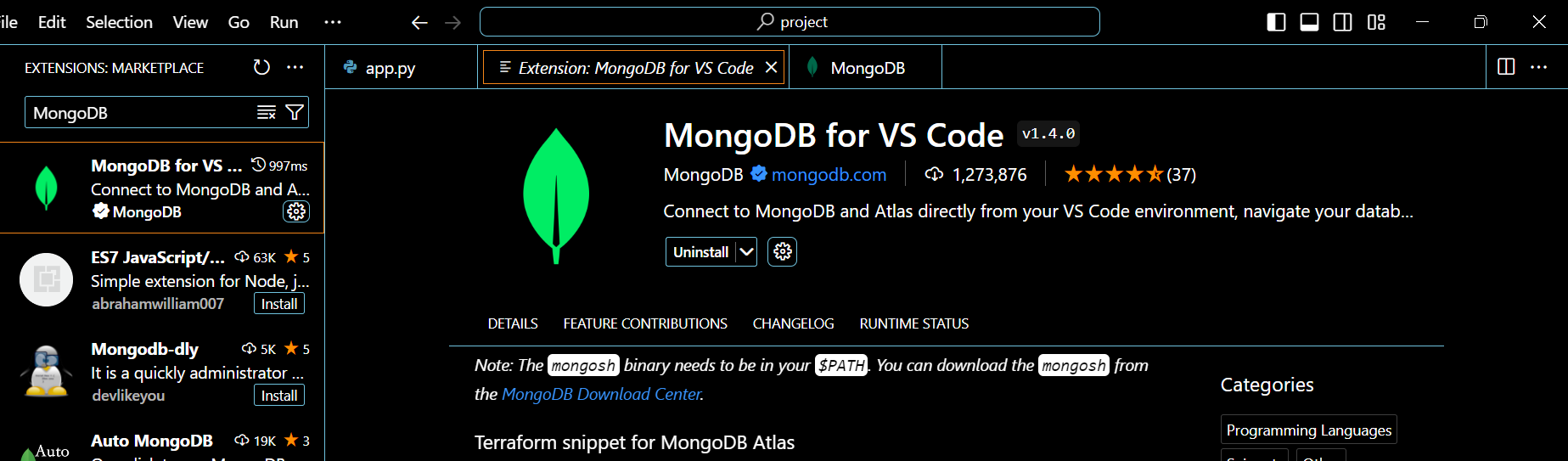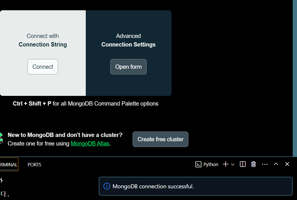 먼저 visual basic code에서 구동될 Flask와 MongoDB를 연결하는 부분에서 여러 방법들이 존재하는데, 그중 MongoDB를 따로 다운로드해서 앱으로도 사용 가능하지만, 저는 컴퓨터에 조금이라도 부담을 줄이는 방법을 선택하게 되었습니다.